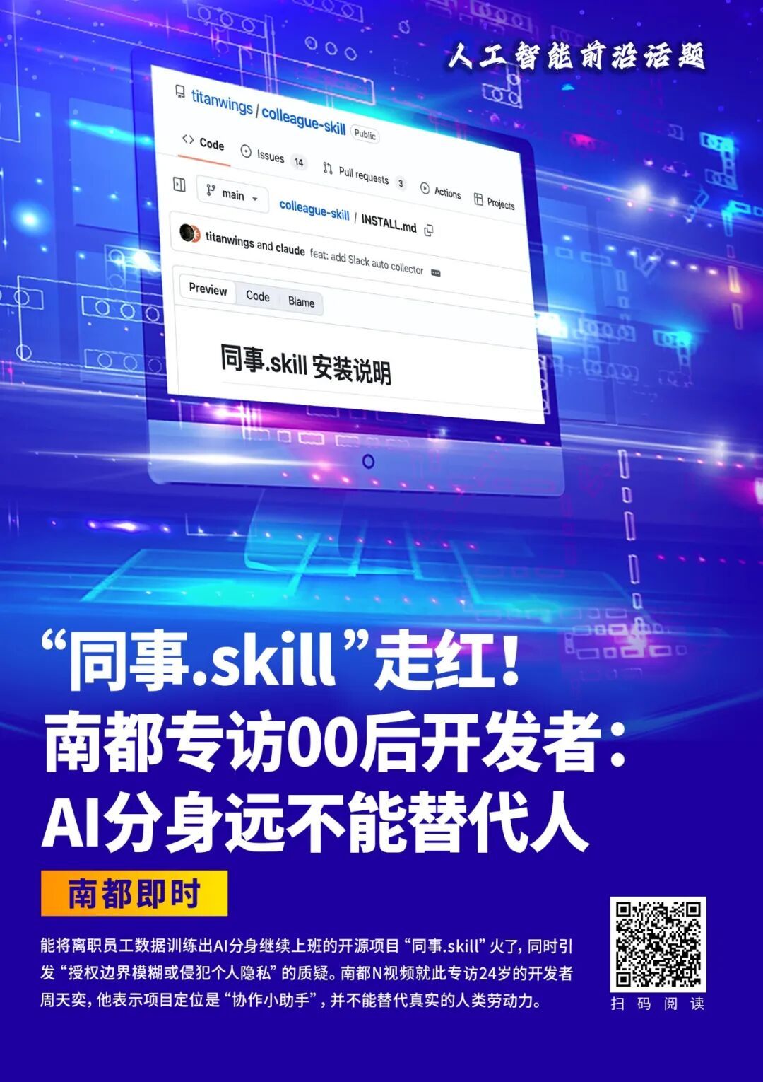 该项目自3月30日上线以来,迅速在全球开源代码托管平台GitHub上走红,而山东一游戏传媒公司运用“同事.skill”,将离职员工数据训练出“AI分身”继续上班引爆舆论后,再次将这一人工智能技能带至普通公众的视野里。